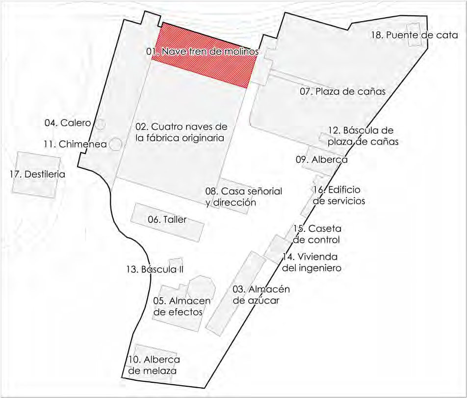 Dado que cuenta en su interior con la maquinaria de mayor interés y dadas las características de esta (proporciones y carácter fijo de la misma), la intervención lógica debe estar dirigida a su consolidación y recuperación como contenedor, conservando el espacio y su distribución así lo elementos arquitectónicos de interés. Un aspecto clave y que será estudiado serán los accesos y circulación interior.